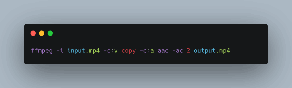 input.mp4 が入力ファイル、 output.mp4 が出力ファイル。 -c:v copy は動画エンコードを変更しないと言う呪文。 -c:a aac -ac 2 は音声フォーマットを一般的な aac にしてステレオ音声(つまり 2 チャンネル)にする呪文です。もちろん ffmpeg がインストールされていることが条件ですね。