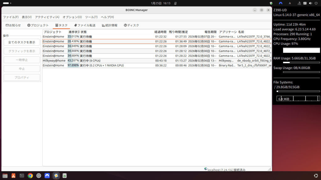 サーバー版と同じように BOINC client のみを入れて動作させようとしていたんだが、 Einstein@Home のタスクが落ちてこない。登録をやり直したりインストールをやり直したりしたが、いっこうに埒があかない。根本的な問題点があるように思うのだけど、仕事が忙しかったりして時間が取れず放置したままになっていた。